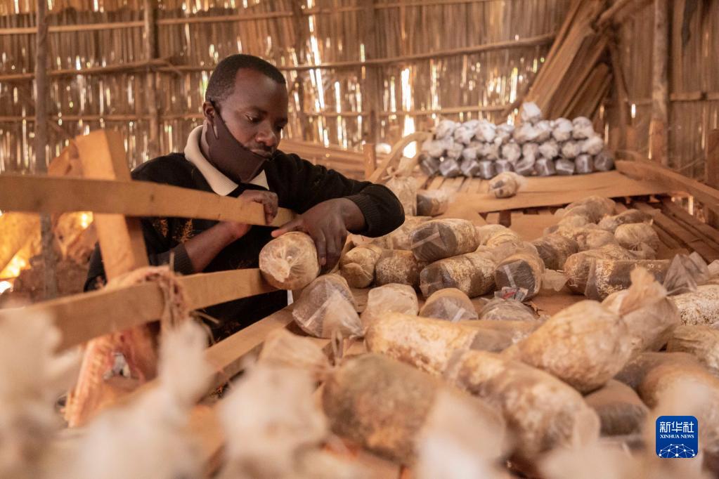 在盧旺達首都基加利的一家食用菌培育作坊,作坊主人埃馬紐埃爾•阿希馬納檢查菌袋(2020年9月9日攝)。中國福建農林大學的菌草專家2006年來到盧旺達開始菌草技術合作項目,在當地示範和推廣菌草技術。(新華社發 西裏爾•恩德格亞攝)