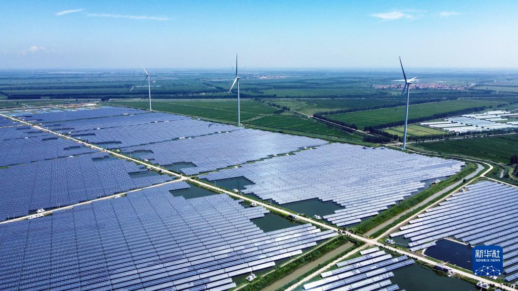 這是在天津市寧河區寧河鎮大月河村拍攝的110千伏大月河光伏電站(2022年7月18日攝,無人機照片)。(新華社記者 孫凡越 攝)