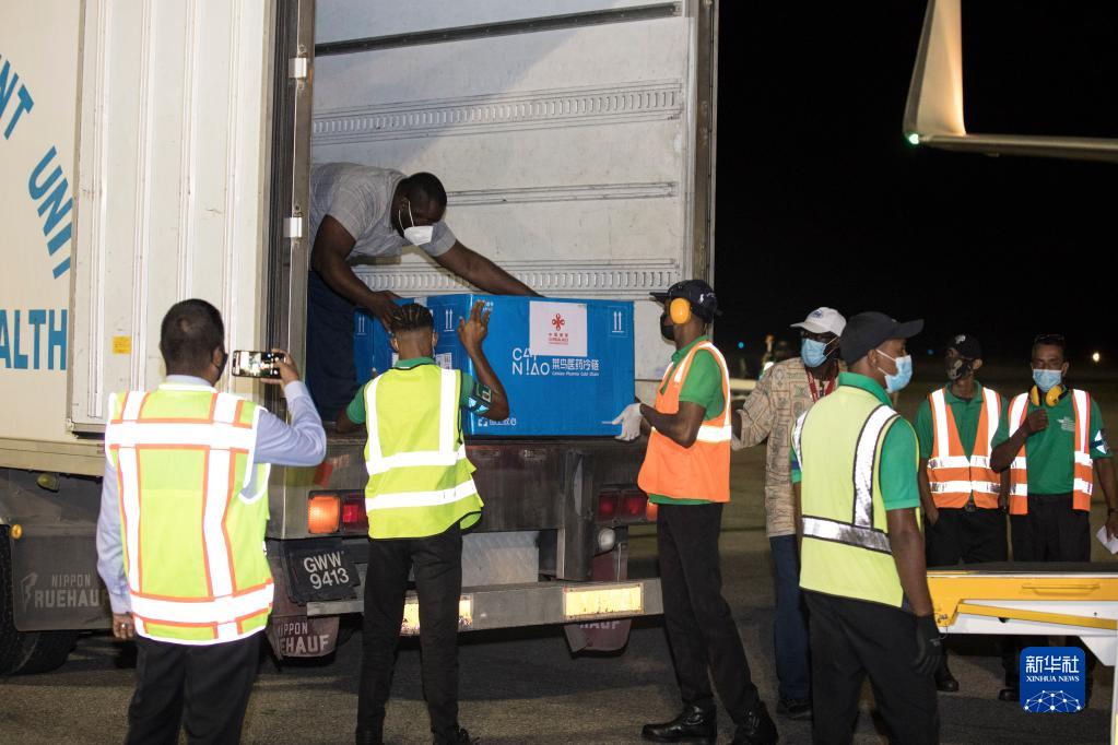工作人員在圭亞那首都喬治敦國際機場搬運中國援助的新冠疫苗(2021年3月2日攝)。(新華社發 圭亞那新聞署供圖)