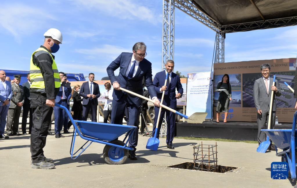 在塞爾維亞首都貝爾格萊德,塞爾維亞總統武契奇(中)為歐洲地區首家中國疫苗工廠奠基(2021年9月9日攝)。(新華社發 普雷德拉格•米洛薩夫列維奇 攝)