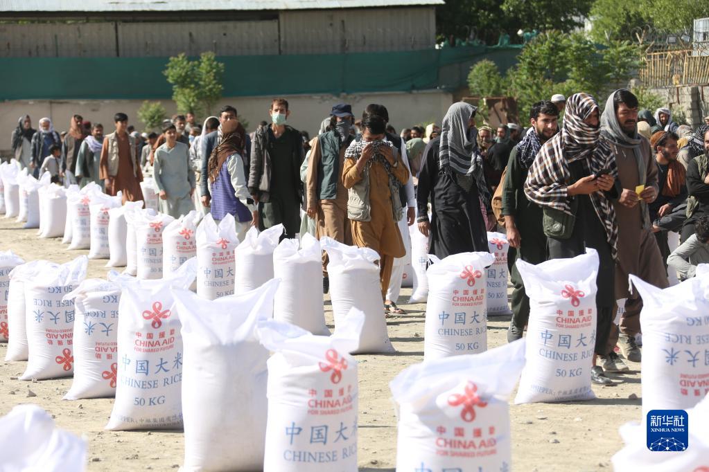 阿富汗民眾在首都喀布爾領取中國援助的糧食(2022年4月23日攝)。(新華社發 塞夫拉赫曼•薩菲攝)