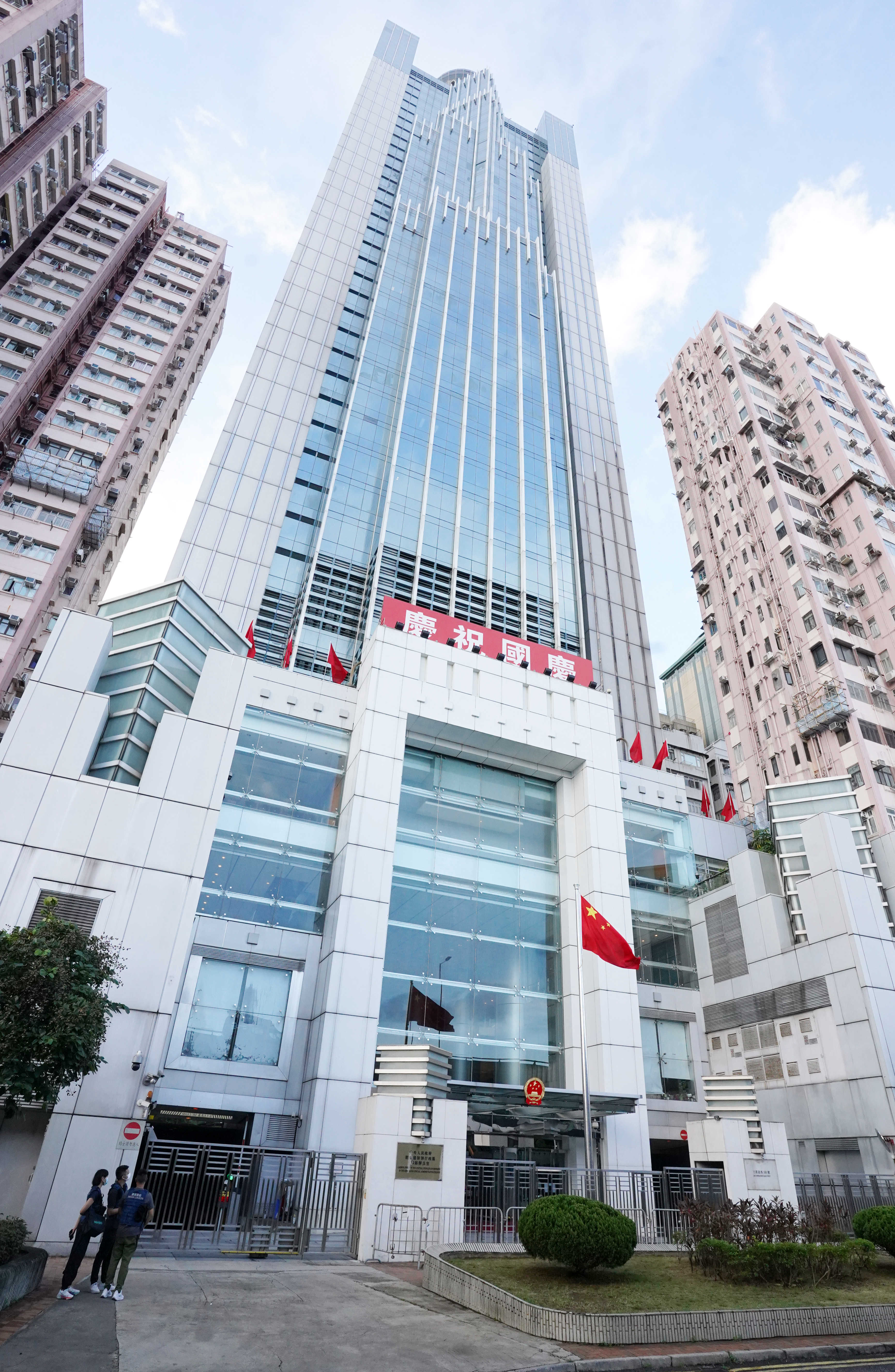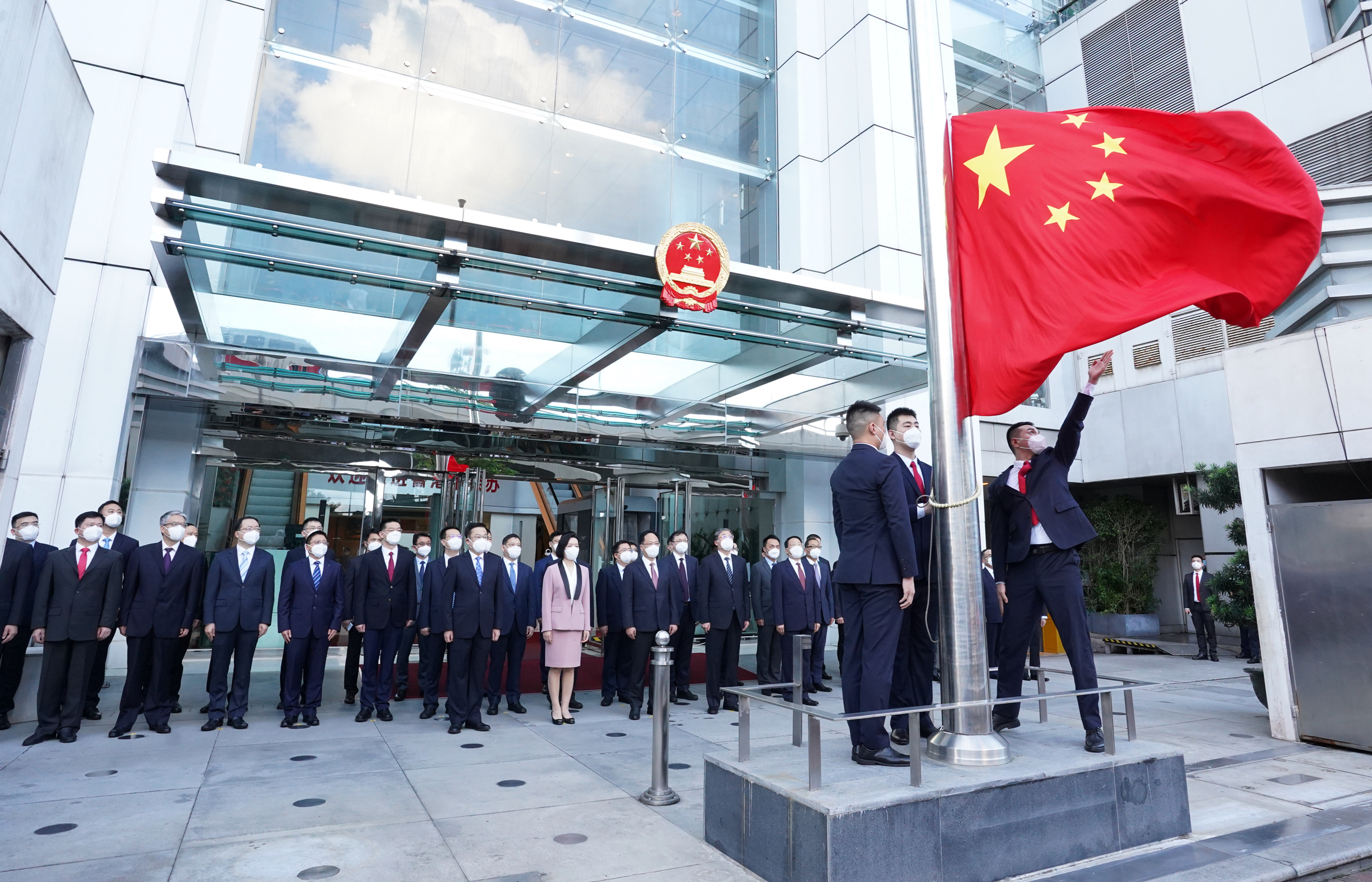7時整,升國旗儀式開始。香港中聯辦副主任陳冬、盧新寧、羅永綱、何靖、尹宗華,以及幹部員工代表在辦公樓前莊嚴肅立。升旗手護送國旗進場,步伐鏗鏘。伴隨着雄壯的國歌聲,鮮艷的五星紅旗冉冉升起。全體人員行注目禮向國旗致敬,齊聲高唱國歌,祝福偉大祖國繁榮富強、國泰民安。