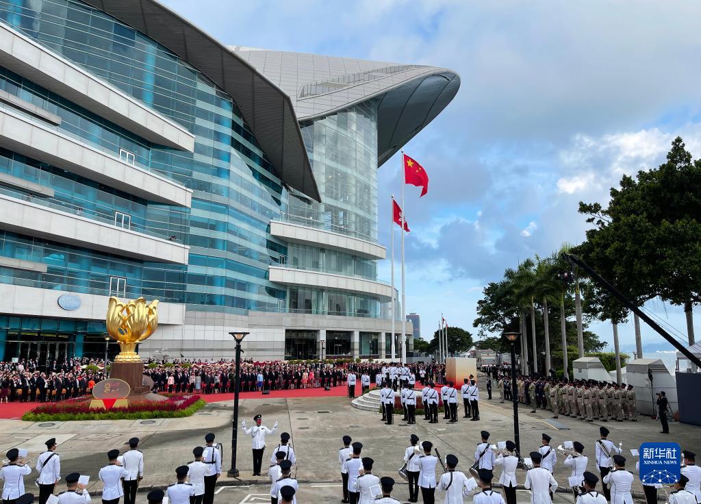全國政協副主席梁振英,香港中聯辦、中央駐港維護國家安全公署、外交部駐港特派員公署、解放軍駐港部隊負責人,以及香港社會各界知名人士出席了升旗儀式和慶祝酒會。