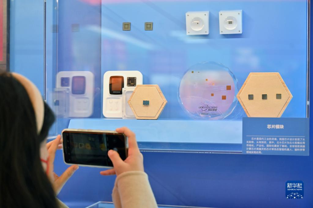 10月8日,一名觀眾拍攝名為「方寸之間」的陳列墻上的芯片模塊展示。(新華社記者 李鑫 攝)