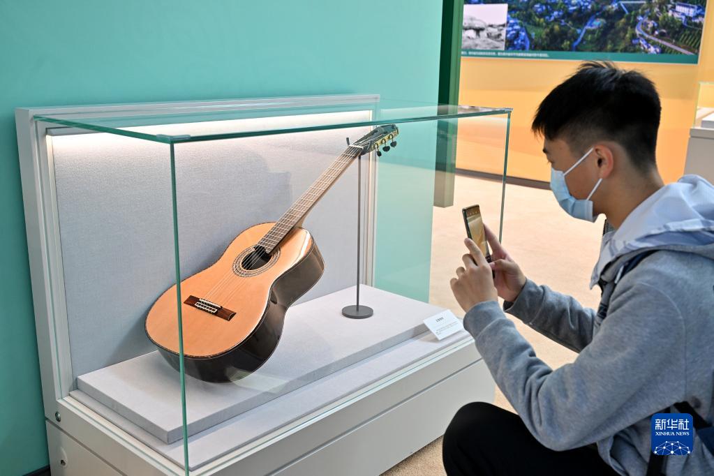10月8日,一名觀眾在貴州展區拍攝正安吉他。貴州省正安縣目前已成為全球最大吉他生産基地,已帶動近15000人在家門口就業、6000餘人穩定脫貧。(新華社記者 李鑫 攝)