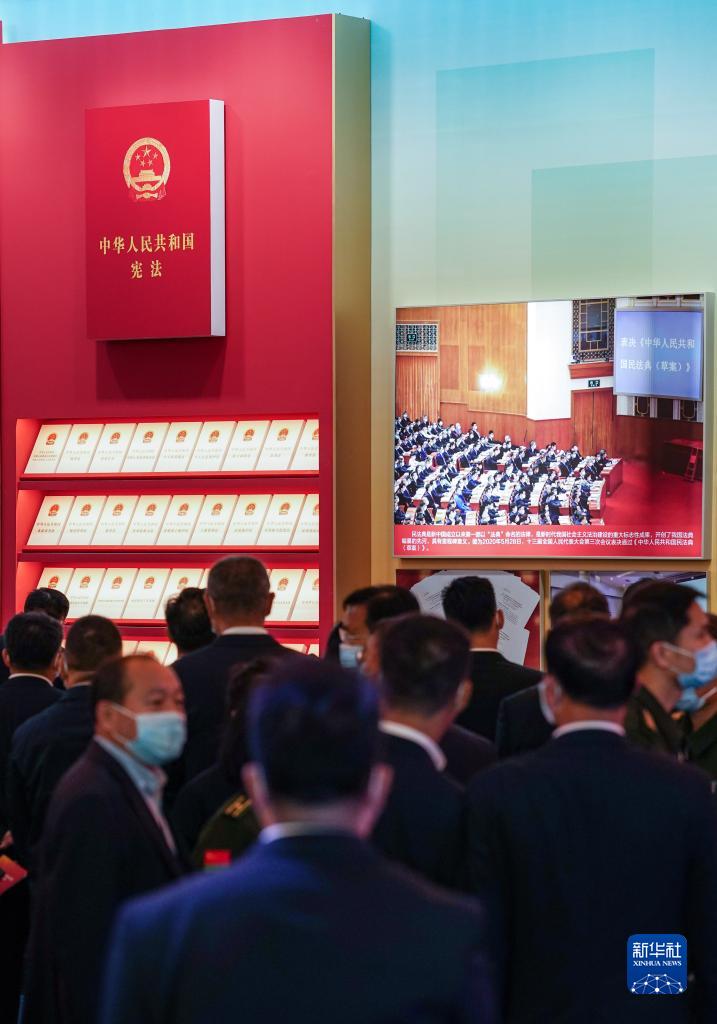 莊重肅穆的法律展示區,大幅憲法圖標居於最高位置,黨的十八大以來新制定的部分法律法規依次陳列,象徵着以憲法為核心的中國特色社會主義法律體系不斷完善。