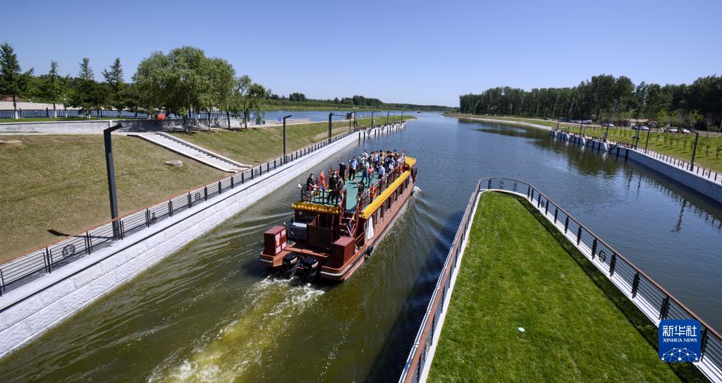 2022年6月24日,京杭大運河京冀段全線62公里實現遊船通航。這是載着北京游客和建設者代表的遊船通過船閘進入京杭大運河河北段。(新華社記者 李欣 攝)