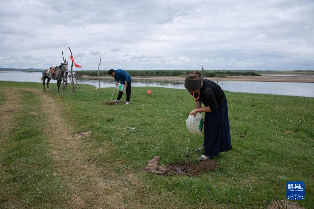 四川省若爾蓋縣麥溪鄉嘎沙村巡河隊的村民在黃河邊給新種的柳樹澆水(2022年7月26日攝)。(新華社記者 江宏景 攝)