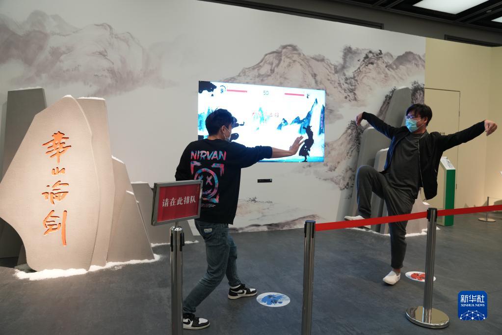 10月28日,觀眾在展覽現場體驗互動裝置「華山論劍」。(新華社記者 劉穎 攝)