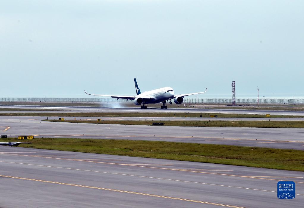 11月25日,一架客機降落香港國際機場第三跑道。(新華社記者 盧炳輝 攝)