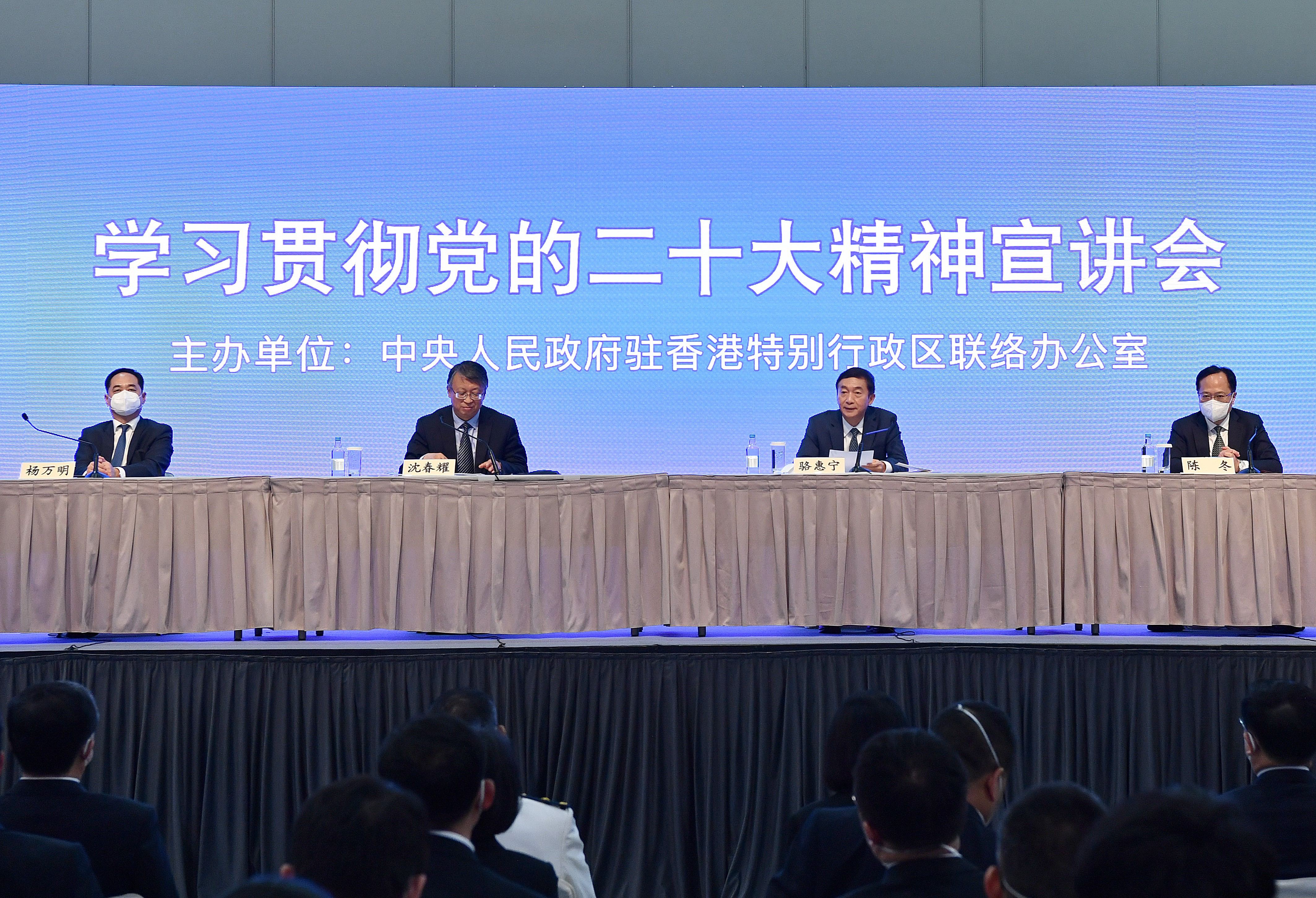 駱惠寧在主持講話中指出,中央宣講團來港宣講,充分體現了以習近平同志為核心的黨中央對香港「一國兩制」事業的高度重視,對中央駐港機構、中資企業的親切關懷。沈春耀主任的精彩宣講,對於我們進一步加深對二十大精神的領悟,把思想和行動統一到二十大部署要求上來,把學習宣傳貫徹工作更好引向深入,具有重要引導和促進作用。要以此次中央宣講為契機,進一步貫徹落實好習近平總書記關於「全面學習、全面把握、全面落實」的重大要求,把學習宣傳貫徹二十大精神與深入貫徹落實習近平總書記7月1日在港重要講話結合起來,把總體把握二十大戰略部署與推進「一國兩制」實踐結合起來,把發揮中央駐港機構帶頭作用與激發社會各界主動性結合起來,學深悟透,學以致用,把學習宣傳貫徹二十大精神的成果,轉化為紮實推進自身工作的實際行動,進一步激發建設香港、貢獻國家的強大正能量。