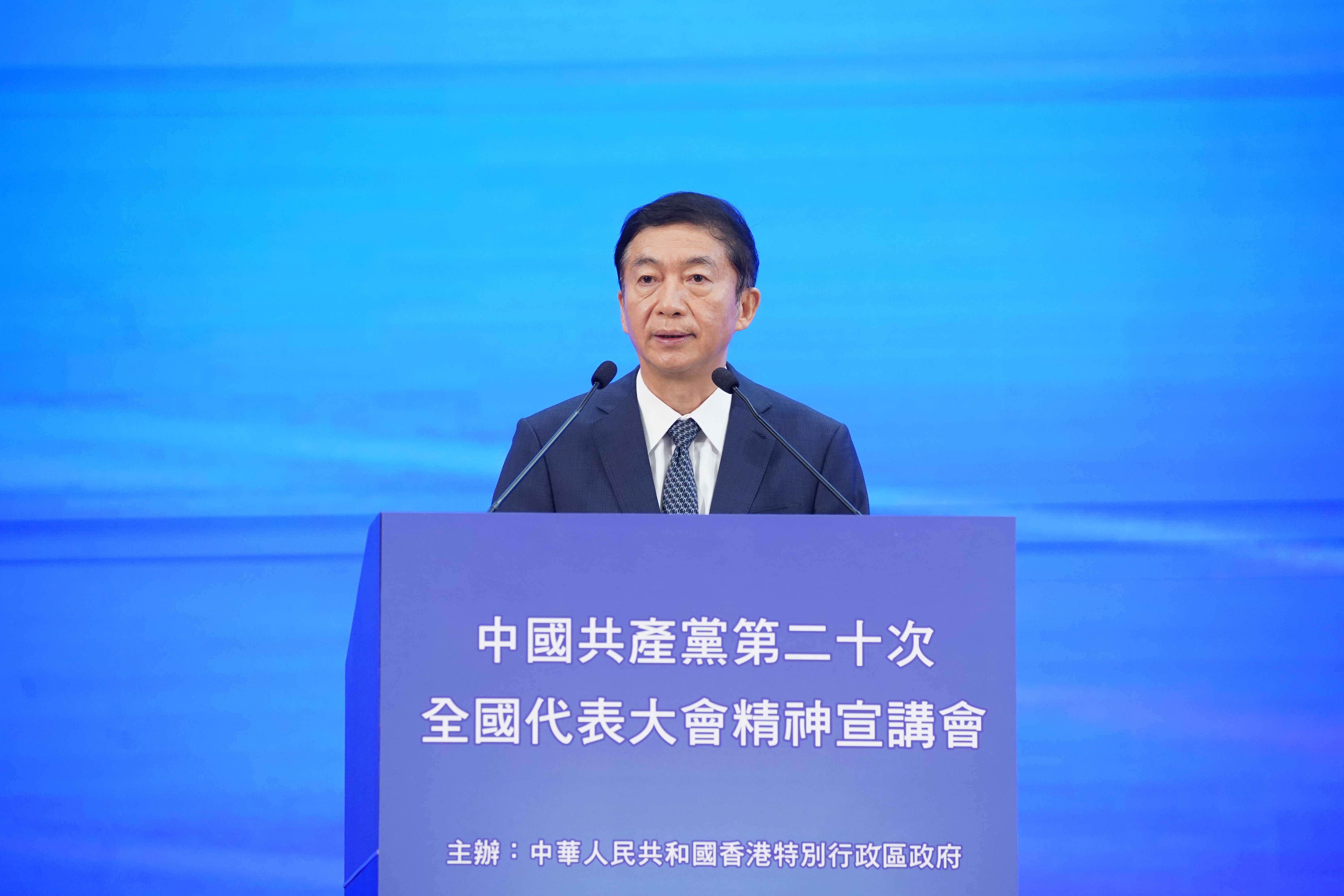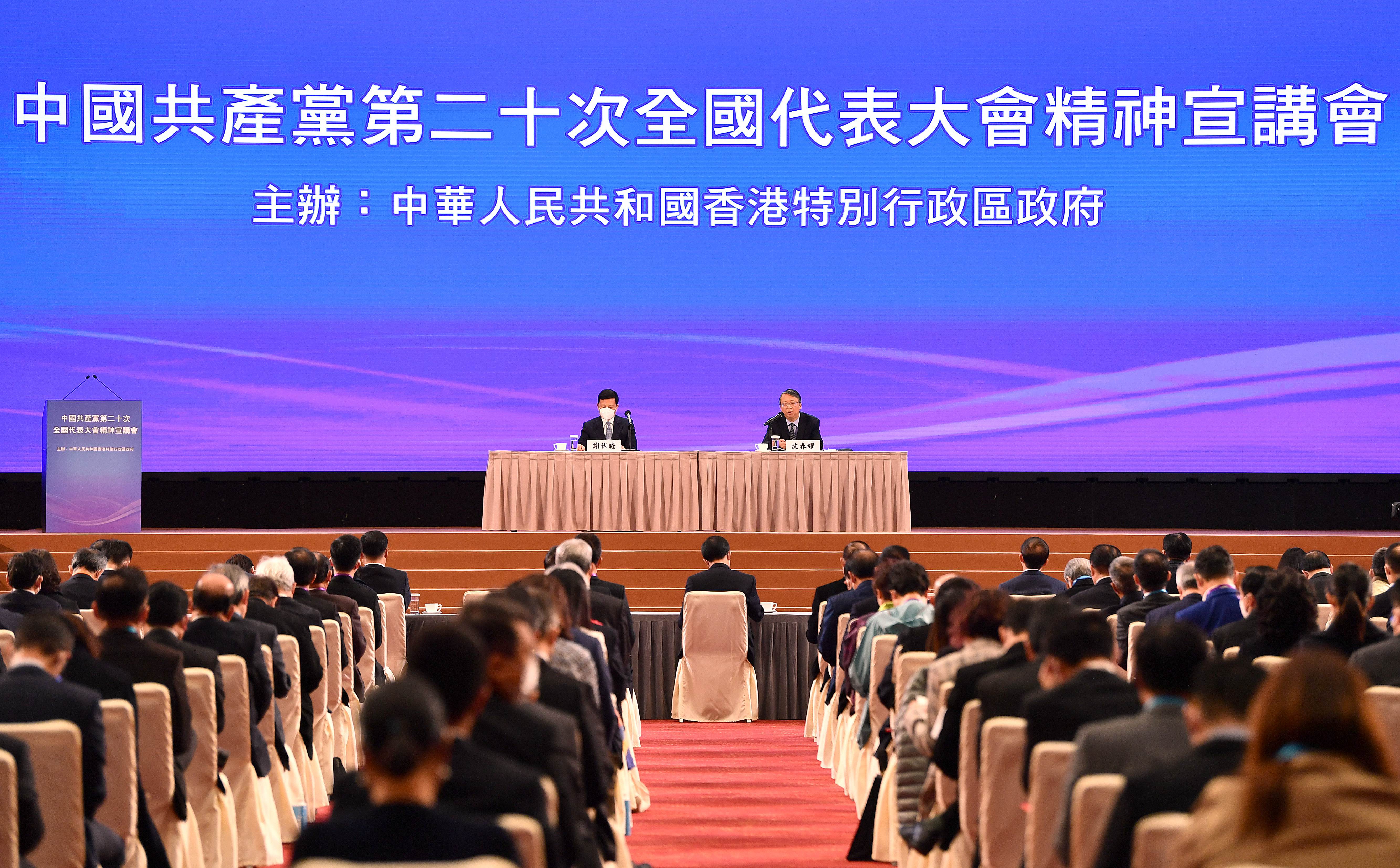 李家超表示,二十大精神關係到國家與香港的未來發展,關係到中華民族的偉大復興,關係到「一國兩制」實踐的行穩致遠、香港的長期繁榮穩定。未來五年是香港開創新局面、實現新飛躍的關鍵期。正確了解二十大精神,將有助我們實踐「一國兩制」行穩致遠,有助香港更好融入國家發展大局。