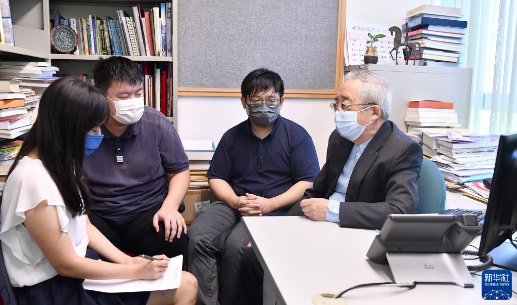 11月26日,香港嶺南大學高級研究員、香港地方志中心事務顧問劉蜀永(右一)在辦公室與助理交流。新華社記者 陳鐸 攝
