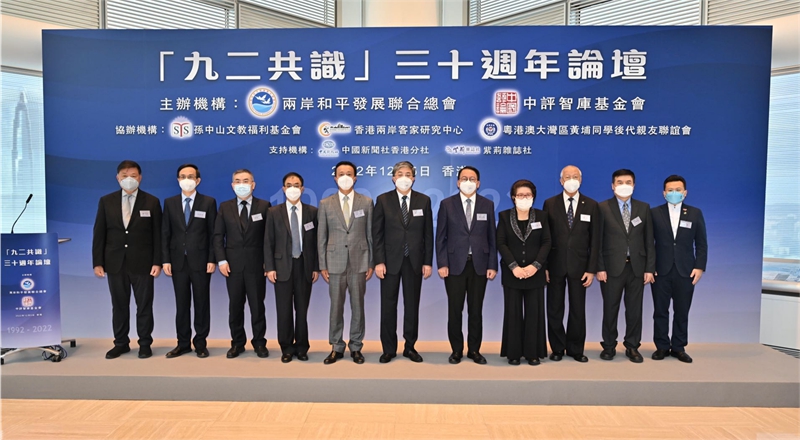 本網訊 12月5日,由兩岸和平發展聯合總會、中評智庫基金會聯合主辦的「九二共識」30周年論壇在港舉行。特區政府政務司司長陳國基、中央政府駐港聯絡辦副主任羅永綱出席並致辭,海峽兩岸關係協會會長張志軍、國民黨前主席洪秀柱視頻致辭。香港涉台社團代表、居港台胞逾100人參加。