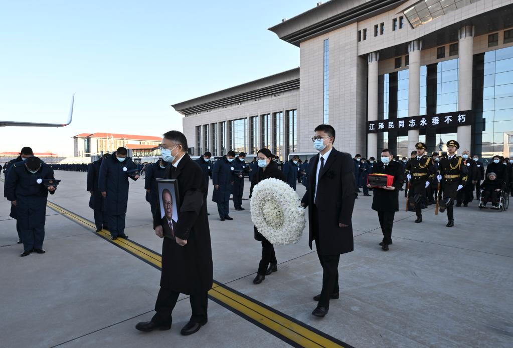 靈車緩緩駛入西郊機場。松柏靜立,遠山靜默。空軍官兵列隊脫帽,目送載護江澤民同志骨灰的專機起飛。專機盤旋着,在首都北京上空緩緩繞飛一周,告別這一江澤民同志為黨和國家事業傾盡心血的地方。