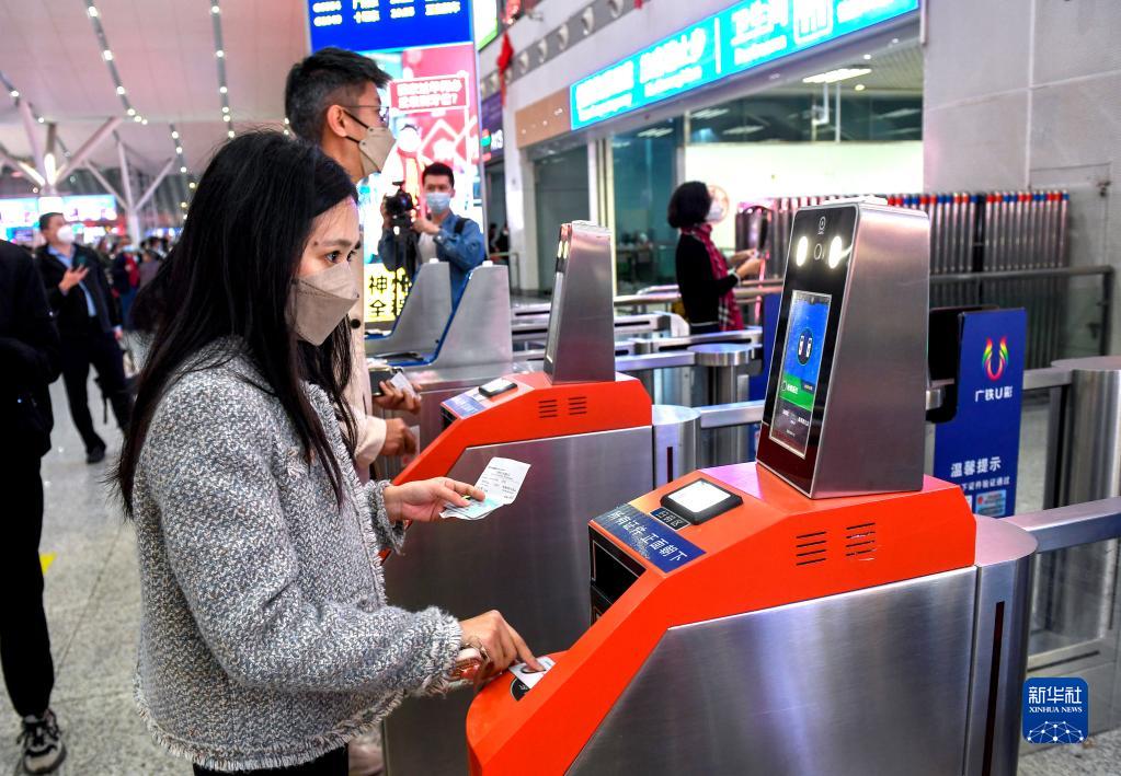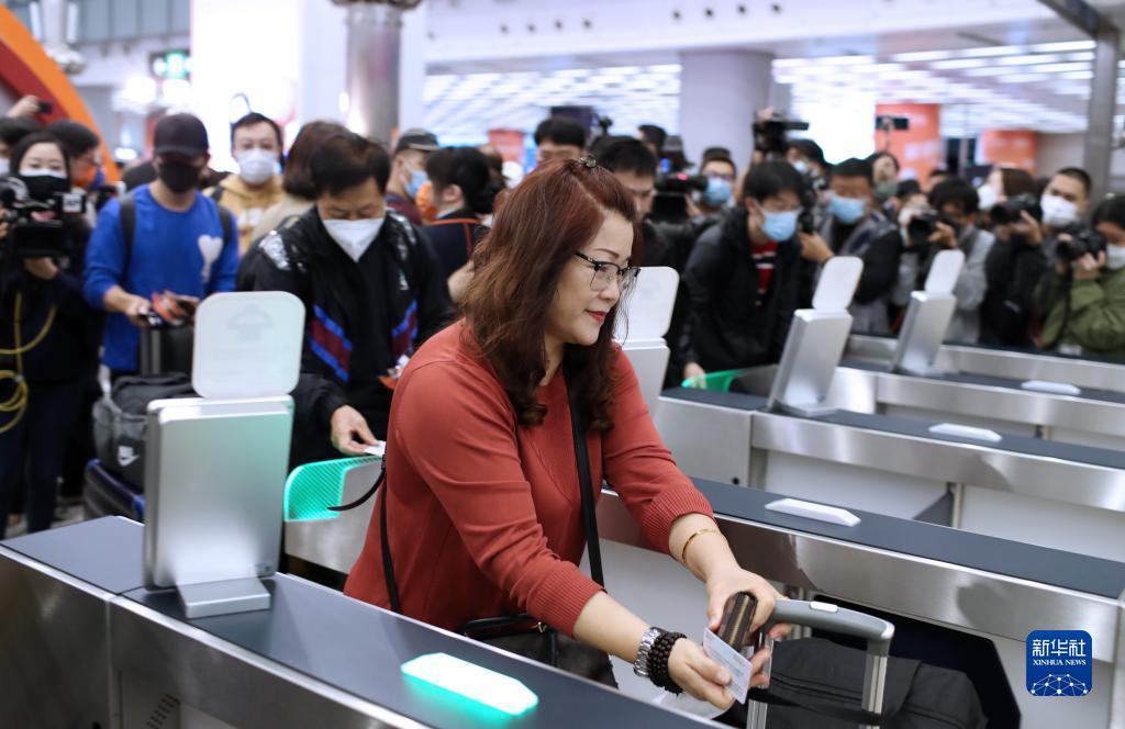 1月15日,在深圳北站,搭乘恢復通車後內地駛往香港首趟列車G5607次的乘客通過閘機進站。(新華社記者 毛思倩 攝)