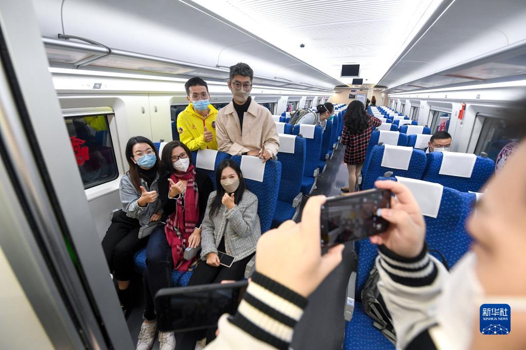 1月15日,在深圳北站,搭乘恢復通車後內地駛往香港首趟列車G5607次的乘客在車廂裏留影。(新華社記者 毛思倩 攝)
