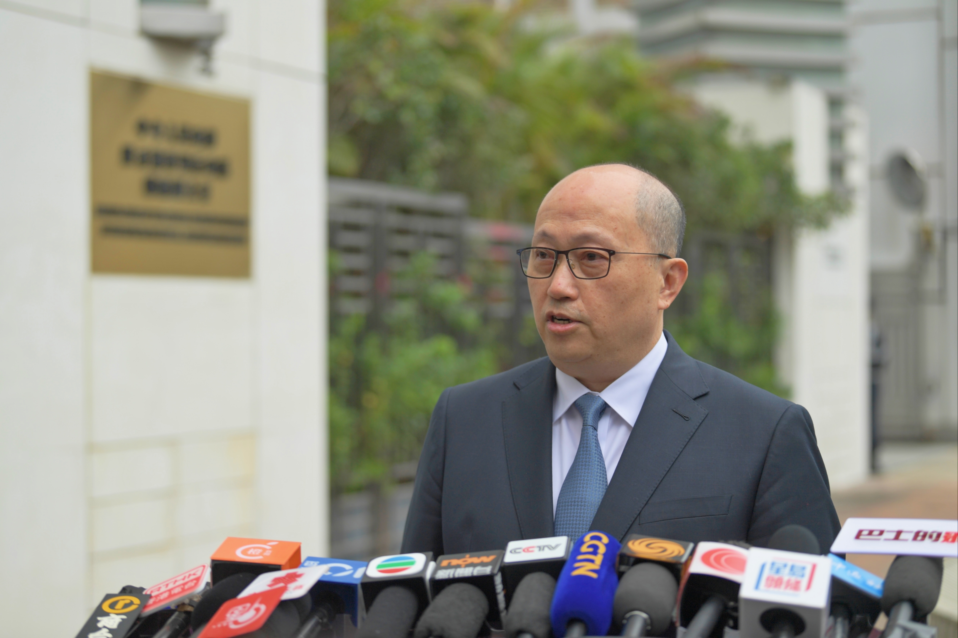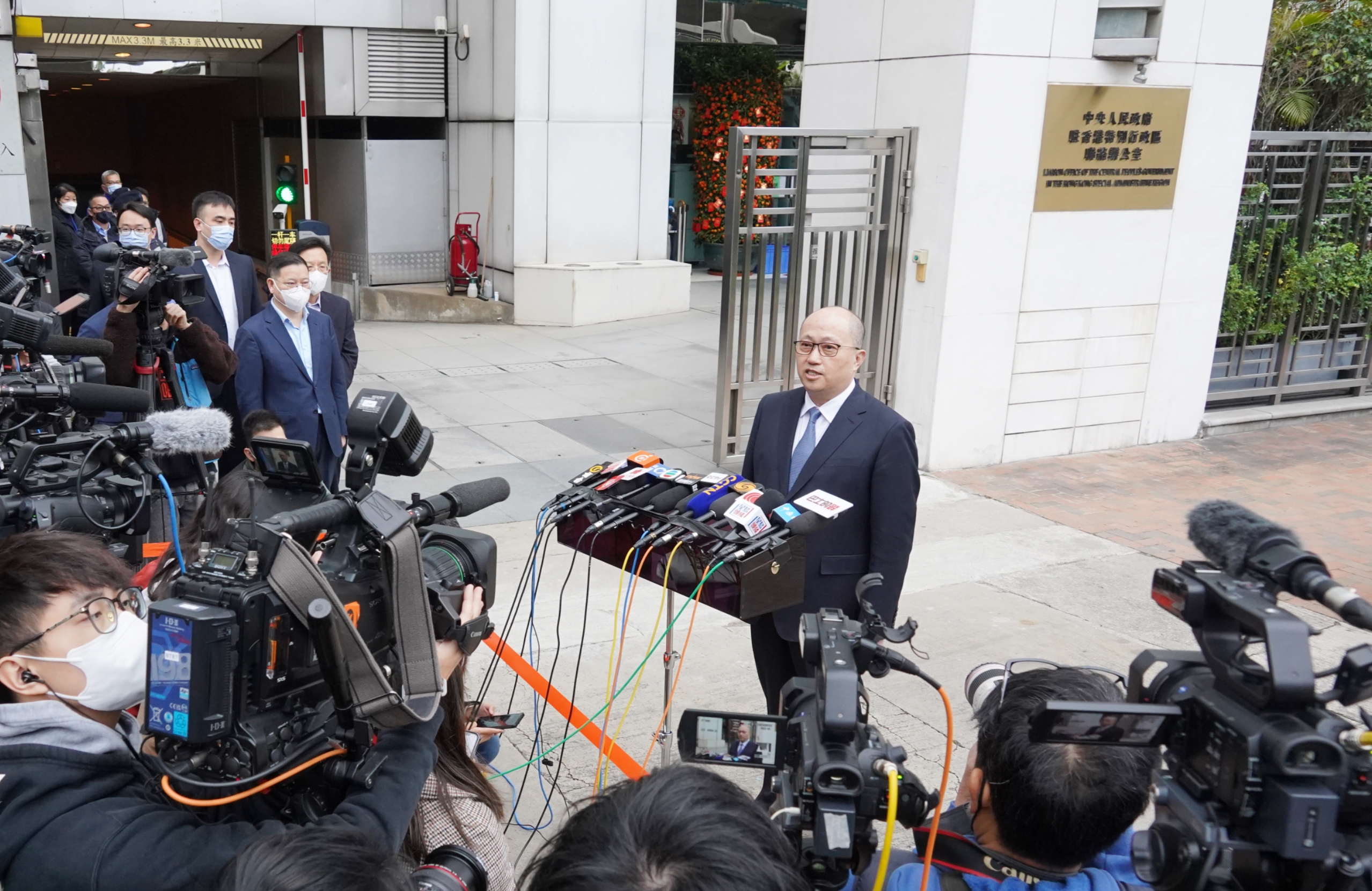 鄭雁雄主任在辦公大樓外與香港傳媒見面。(圖片來源:中央政府駐港聯絡辦)