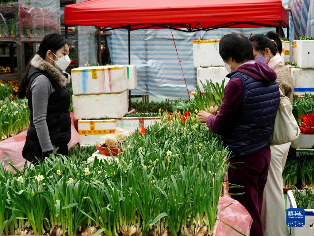 1月16日,在維多利亞公園年宵花市,顧客在選購水仙。(新華社記者 褚萌萌 攝)