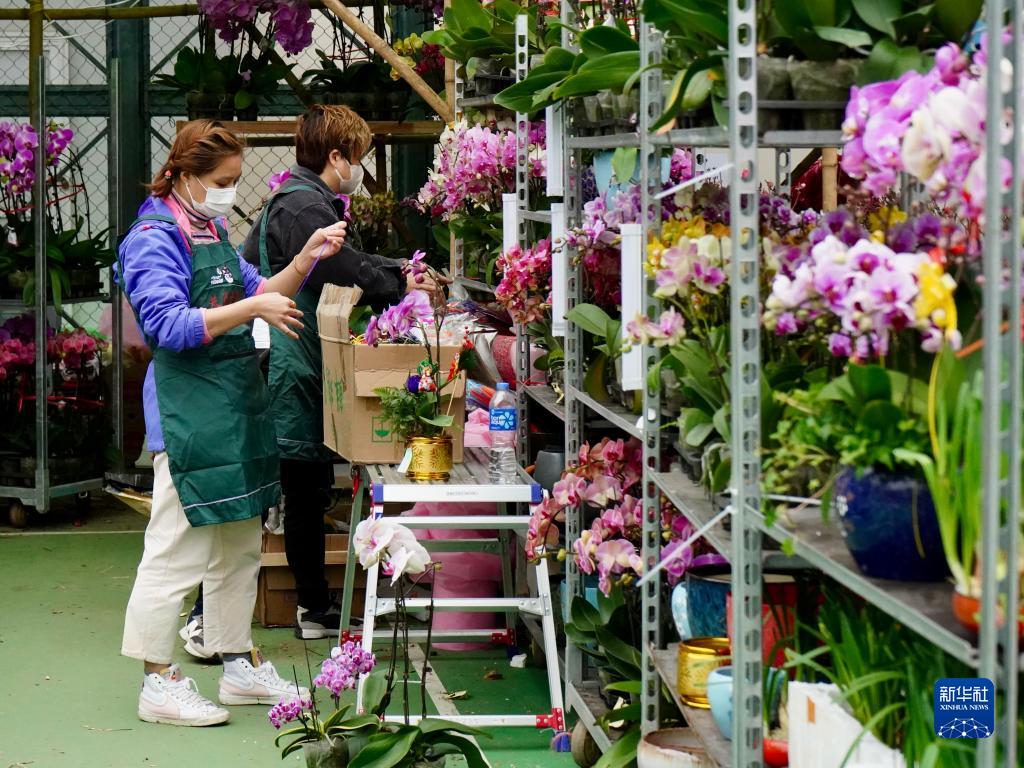 1月16日,在維多利亞公園年宵花市,攤主在佈置花攤。(新華社記者 褚萌萌 攝)