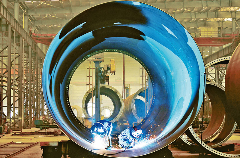 圖為2023年2月8日,江蘇省太倉港經濟技術開發區,蘇州天順新能源科技有限公司生産人員正在焊接風電塔筒單節筒體,奮力實現首季「開門紅」。(人民圖片 計海新/攝)