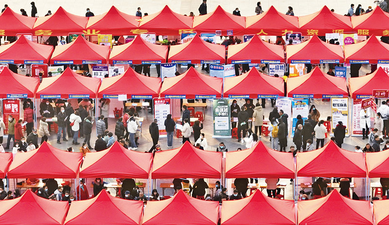新春伊始,各地舉行人才招聘會,吸引眾多求職者前來應聘。圖為2023年2月1日,求職者在湖北襄陽人民廣場舉行的招聘會上了解崗位情況。(新華社發 謝勇/攝)