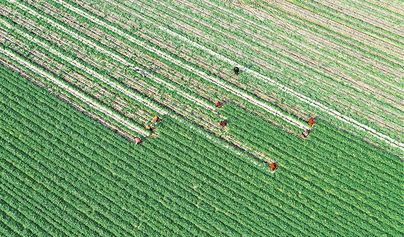 近年來,四川省南充市蓬安縣積極引導沿江群眾將荒置河灘地進行開墾改良,發展蔬菜種植業,帶動農業增效、農民增收。圖為2023年1月31日,蓬安縣錦屏鎮中壩社區沿江蔬菜種植基地裏,菜農們正忙着采收蘿蔔。(人民圖片 周亮/攝)