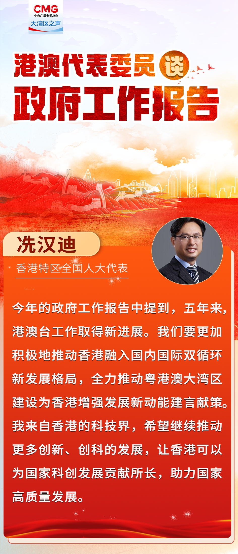 十四屆全國人大一次會議3月5日在北京開幕。多位港澳特區代表委員接受大灣區之聲記者採訪時表示,政府工作報告內容充實,鼓舞人心,港澳各界要緊抓發展機遇,融入國家發展大局,與祖國並進!