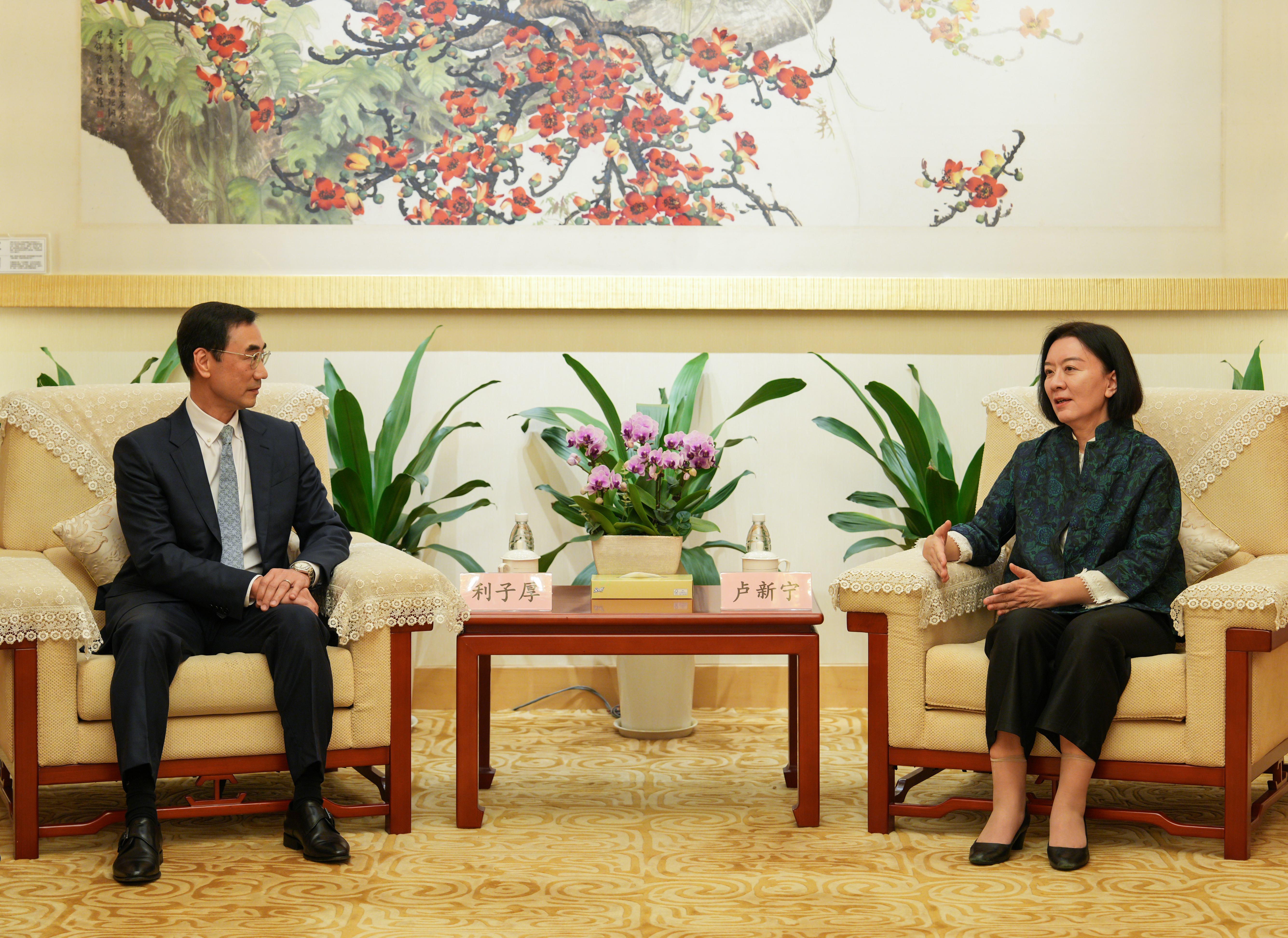 盧新寧副主任與利子厚主席交流。(圖片來源:中央政府駐港聯絡辦)
