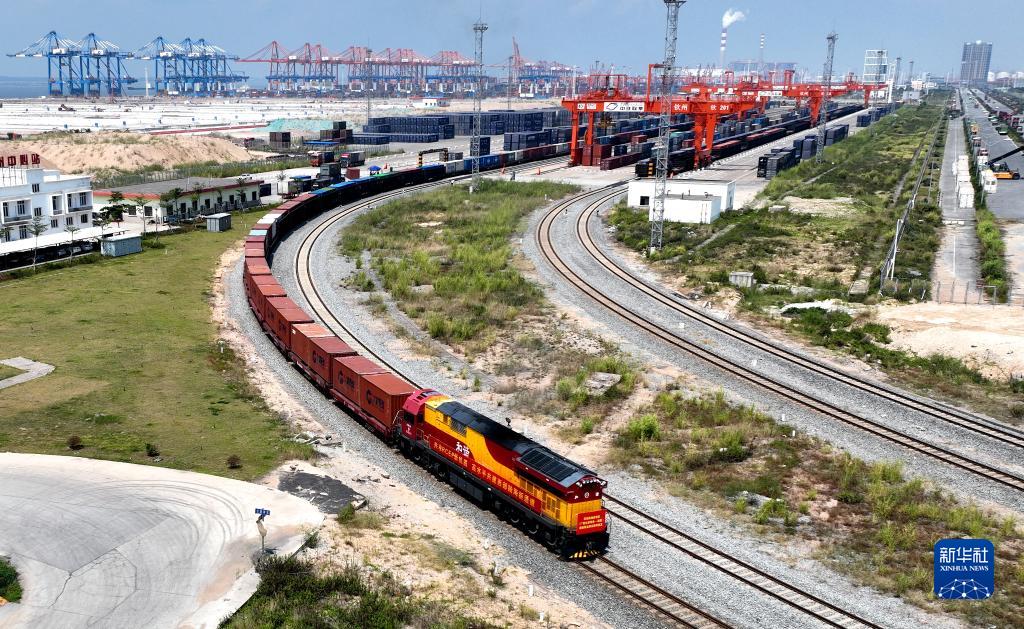 這是從廣西欽州港發出的首趟「北部灣—西藏」班列(2022年9月17日攝,無人機照片)。新華社記者 張愛林 攝
