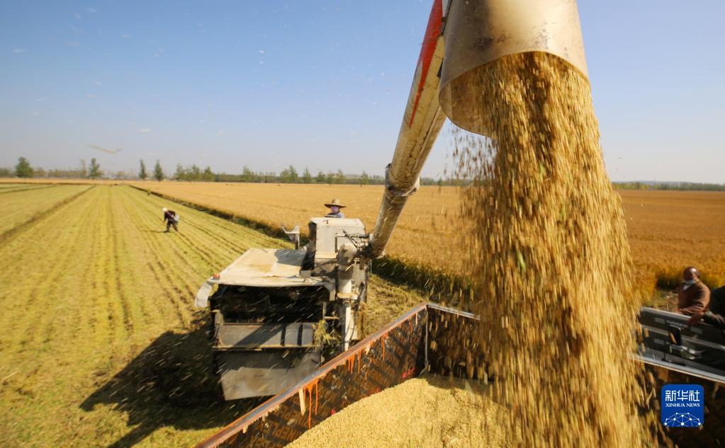 山東省臨沂市郯城縣郯城街道農民將收穫的水稻裝車(2022年10月23日攝)。新華社發(張春雷攝)