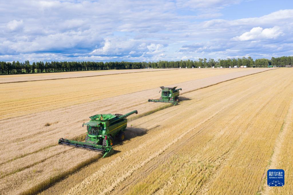 聯合收割機在黑龍江北大荒集團紅星農場有限公司田間收穫小麥(2022年8月10日攝,無人機照片)。新華社記者 謝劍飛 攝