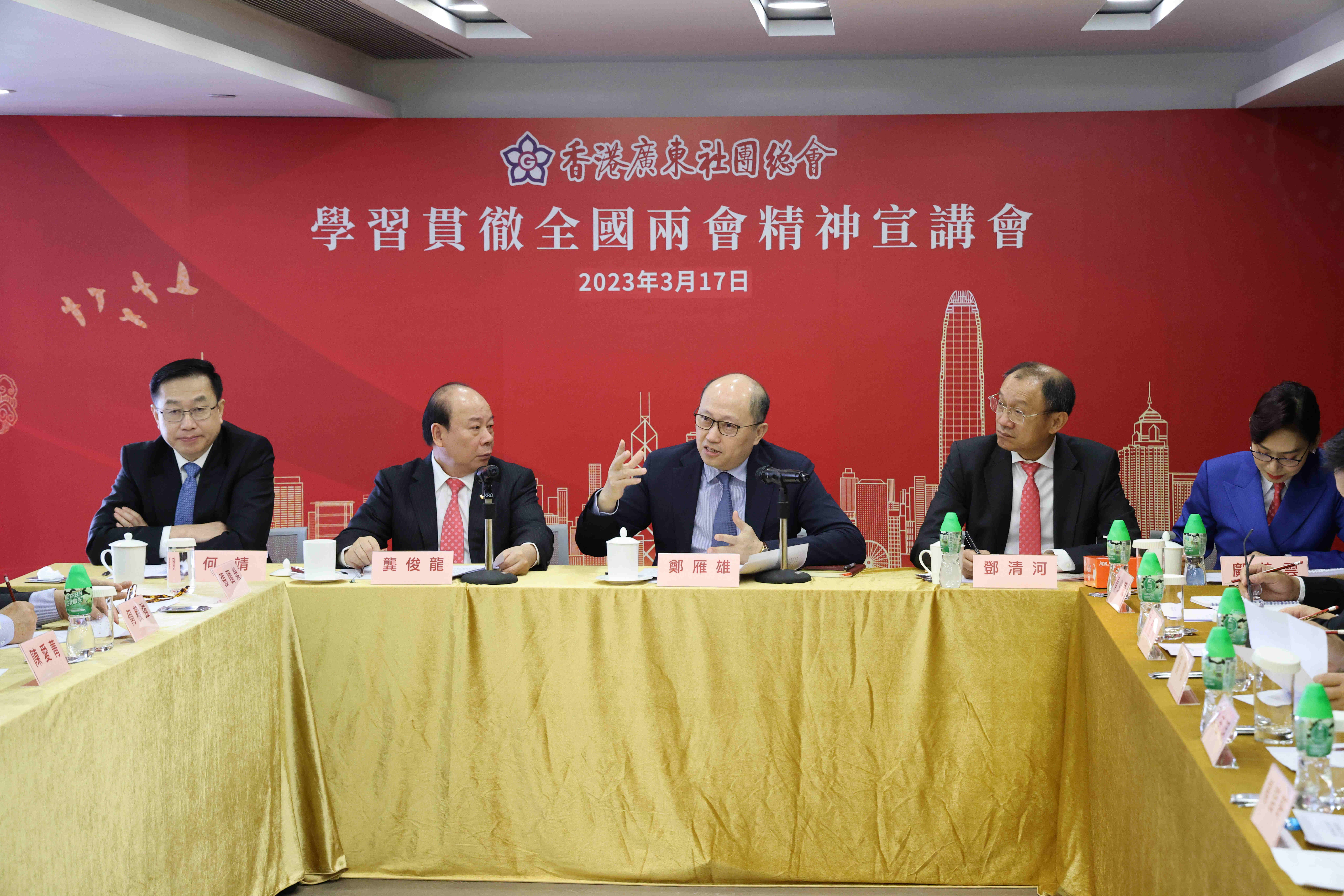 鄭雁雄介紹了全國兩會的重大意義、重大成果和重要精神。他指出,這次大會全面貫徹黨的二十大精神,對強國建設、民族復興進行再動員再部署,凝聚全黨全軍全國各族人民力量團結奮進,為我們續寫「兩大奇蹟」新篇章、保持全球發展領先地位提供了精神力量和決策先手。習近平總書記全票當選國家主席、中央軍委主席,是會議最重要的政治成果,向全世界昭示了中華民族的空前團結。全國兩會精神十分豐富,重點是深刻領會習近平總書記重要講話精神,把握過去五年黨和國家各項事業取得的重大成就、中央對經濟社會發展的重大部署、國家機構改革的重要要求,以及黨中央對香港工作的重視關懷和全國兩會對香港工作的重要部署。