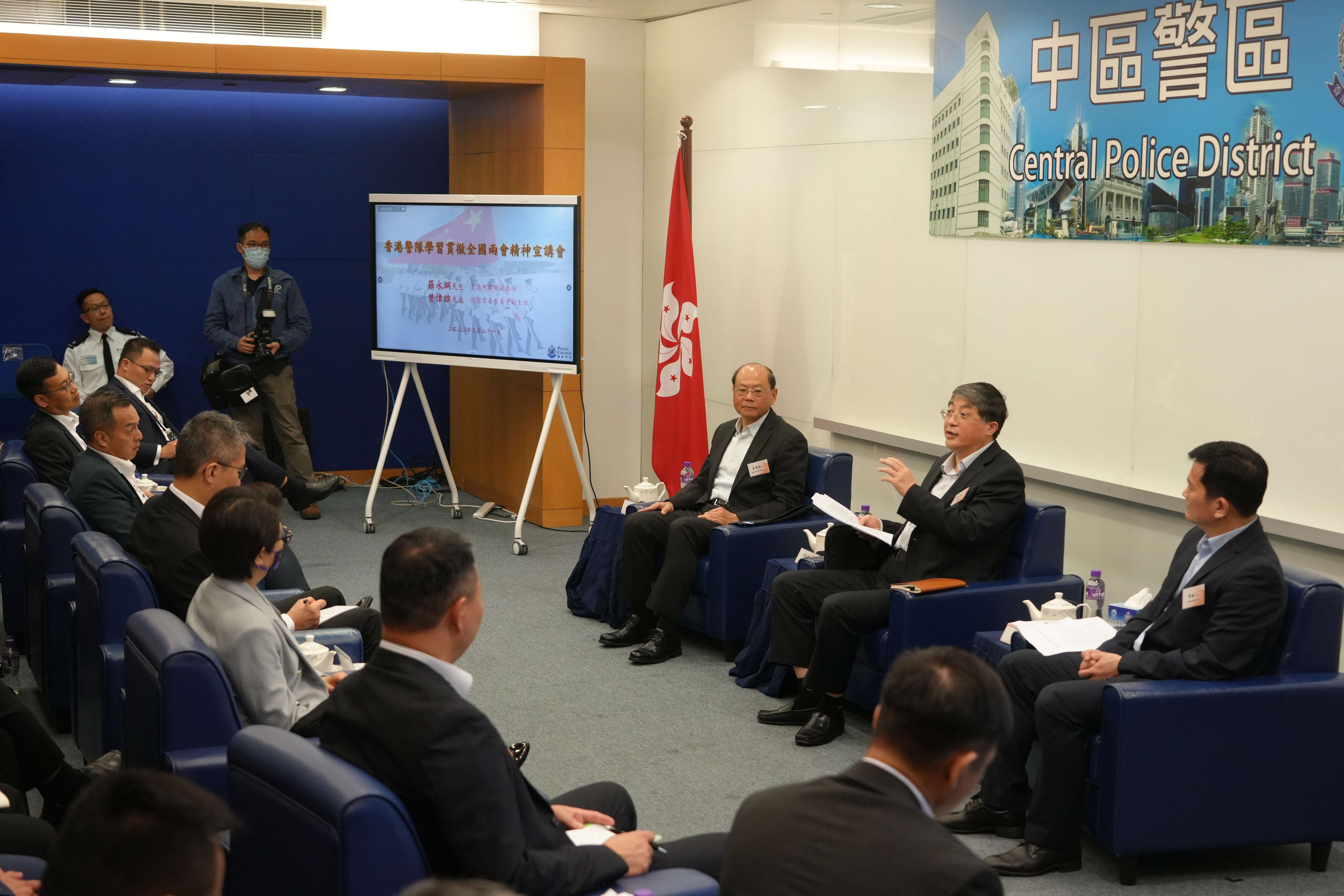 本網訊 3月21日、22日,香港警隊、中國和平統一促進會香港總會分別舉辦全國兩會精神學習宣講會,中央政府駐港聯絡辦副主任羅永綱應邀出席並作交流分享。國家禁毒委副主任曾偉雄、特區政府警務處處長蕭澤頤、警隊部分高層相關代表,中國和平統一促進會香港總會理事長盧文端、監事長林建岳、會長姚志勝、執行會長陳亨利及部分港區全國人大代表、政協委員、會務骨幹等近百人參加。