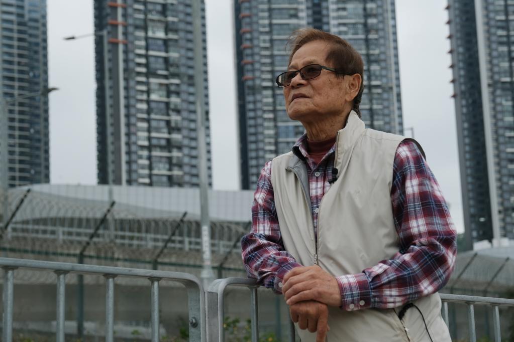 在香港香園圍口岸,85歲的萬秀平站在旅檢大樓前,背後的深圳高層居民樓近在眼前。(新華社記者 王申 攝)