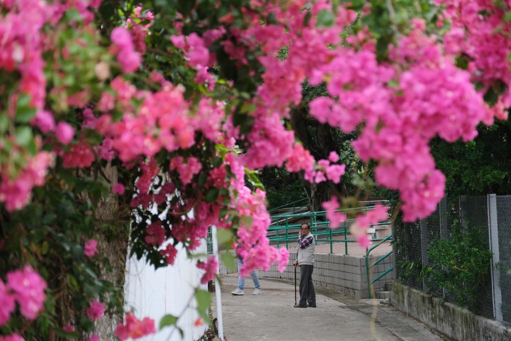 在香港香園圍村,85歲的萬秀平走在村裏。(新華社記者 王申 攝)