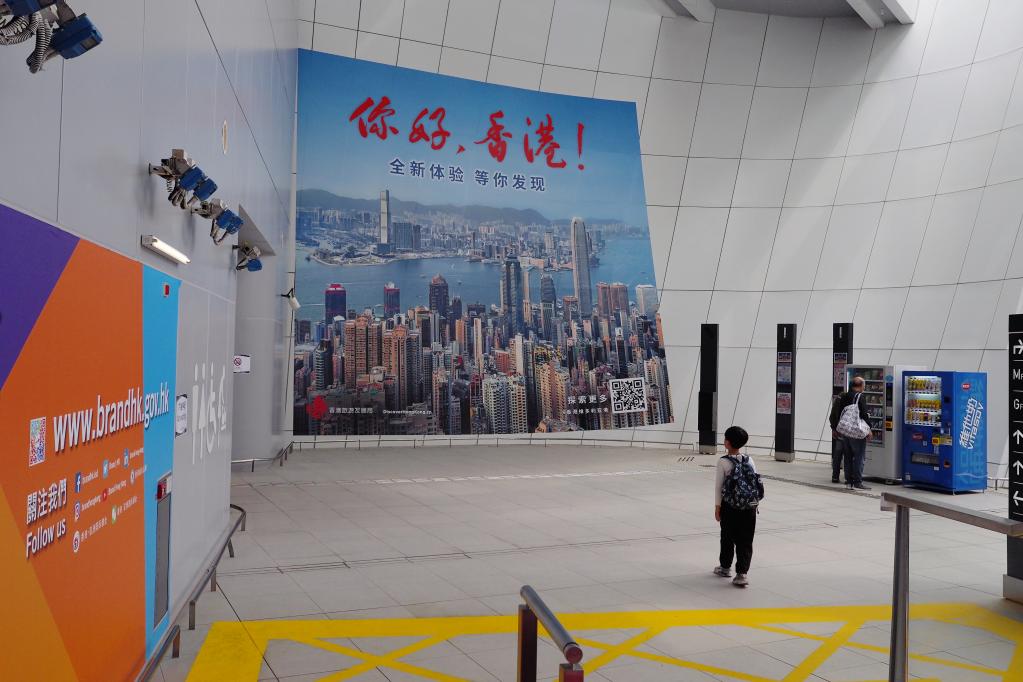 在香港香園圍口岸旅檢大樓,口岸張貼「你好,香港」的大幅廣告歡迎來到香港的旅客。(新華社記者 王申 攝)