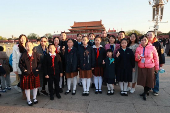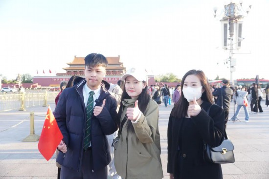 「國旗送給你,香港和我們是一家人。」香港獅子會中學的呂銘琛在觀旗現場意外收穫了一份「禮物」,身旁一位來自河南的女孩得知他是香港同胞後,主動將手中的五星紅旗贈與了他。雖是未曾相識的陌生人,但這句暖心的話語一下子就拉近了兩人之間的距離,他們互加微信,希望即使離開北京後也能保持聯繫。這位河南女孩還熱情地向他邀約:「歡迎你們來河南玩。」在長安街紅墻黃瓦、紅棠綠柳的映襯下,青少年們交往交心的笑容顯得格外明媚。