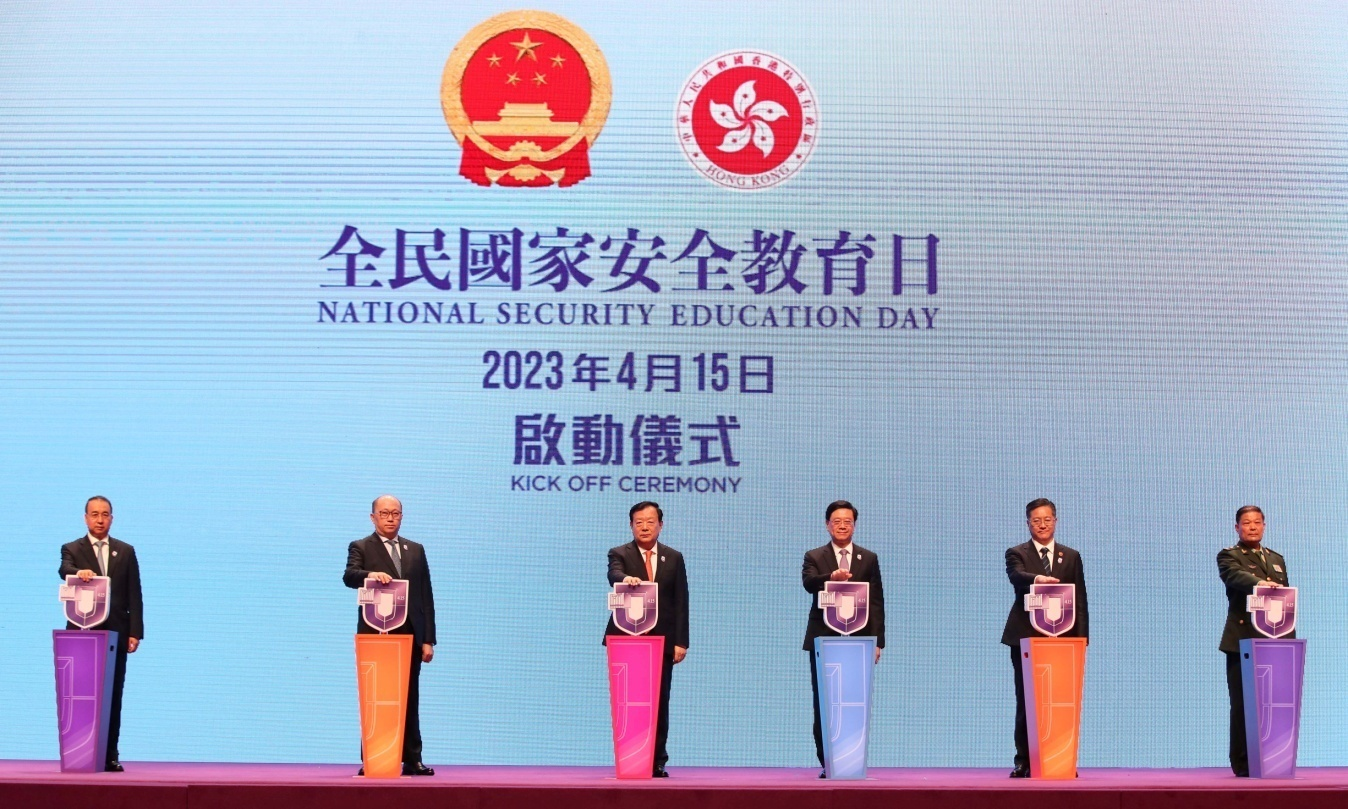 本網訊 4月15日,香港「全民國家安全教育日2023」活動開幕典禮在香港會展中心舉行。十三屆全國政協副主席、國務院港澳事務辦公室主任夏寶龍,香港特區行政長官李家超、中央政府駐港聯絡辦主任鄭雁雄、駐港國安公署副署長李江舟、外交部駐港公署特派員劉光源、駐港部隊司令員彭京堂共同啟動典禮。中央政府駐港聯絡辦副主任陳冬、盧新寧、羅永綱、尹宗華,秘書長王松苗出席。