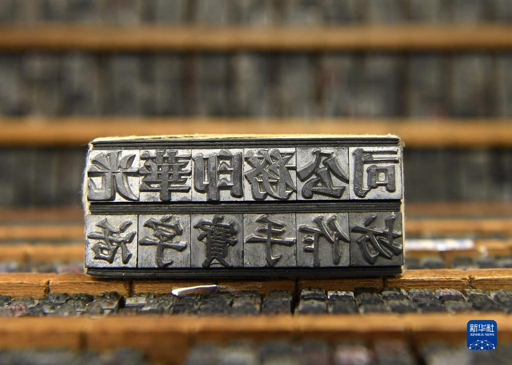 這是3月30日在光華印務公司拍攝的用不同鉛質字粒擺放的「光華印務公司 活字寶手作坊」字樣。(新華社記者 陳鐸 攝)