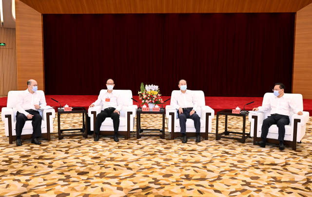 6月8日上午,廣東省委書記黃坤明,省委副書記、省長王偉中在廣州會見了來粵開展專題調研的香港特別行政區第十四屆全國人大代表一行。中央政府駐香港聯絡辦主任鄭雁雄參加會見。