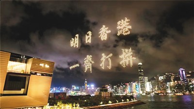 夜空中,無人機隊組合成多種色彩艷麗的圖案:身着民族服裝的兒童手持香囊、五彩繩,奔跑跳躍,緩緩展開的粽葉照亮天際;屈原、楚辭、香草美人,獨特的文化符號喚起民族的共同記憶;吃粽子、放風箏、賽龍舟,特色民俗展示營造了濃濃的節日氛圍。三條龍舟奮力劃行,你追我趕,轉眼間,龍舟又化作巨龍,吐出龍珠,變幻成「東方之珠」高樓林立的繁華夜景,表達出「明日香港,一齊打拼」的壯志豪情。