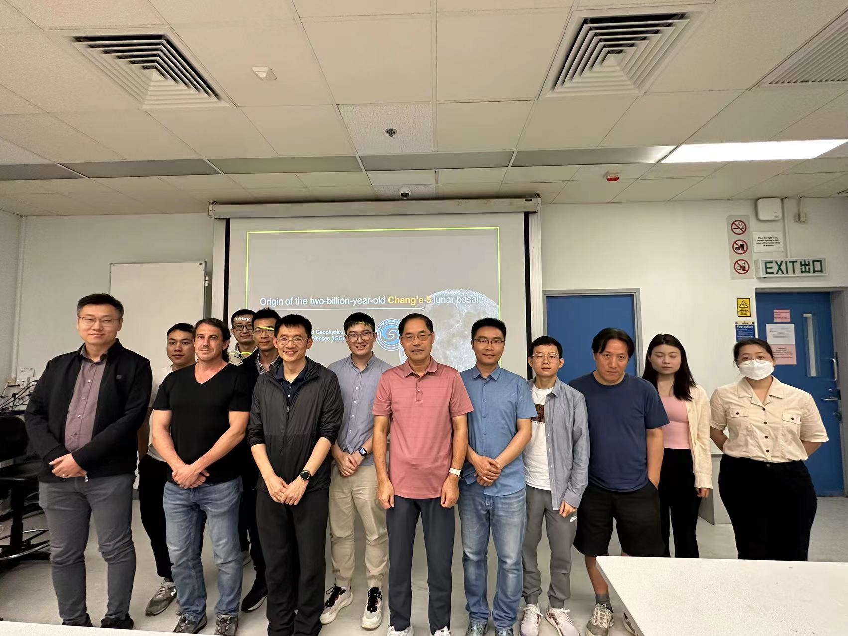 香港大學嫦娥五號樣品申請人錢煜奇(右七)與趙國春院士(右六)、Joe Michalski副教授(左三)、張健教授(左一)、李一良副教授(右三)與中科院楊蔚研究員在香港大學進行嫦娥五號樣品研討。(受訪者提供)