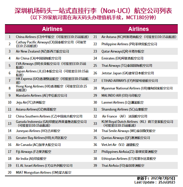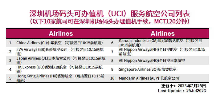 可辦理值機的航空公司:在深圳機場碼頭辦理登機牌、退稅券,行李直接托運至目的地