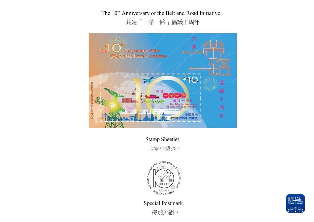 香港郵政推出的郵票小型張和套折,均以中文和英文印上「共建『一帶一路』倡議十周年」,並以航運和航空交通以及物流運輸等相關圖案作為背景。