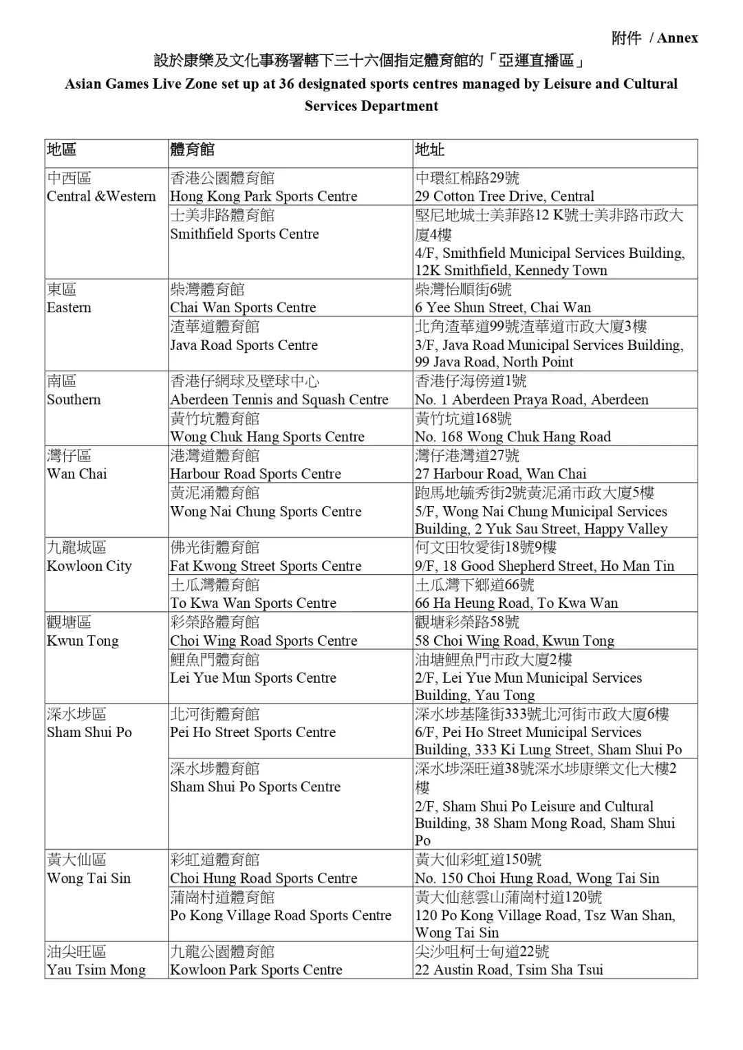 36個指定體育館的亞運直播區當晚8時起開放,9月24日至10月8日期間上午8時至晚上10時30分開放,市民可到場收看亞運會賽事節目,同心撐港隊。