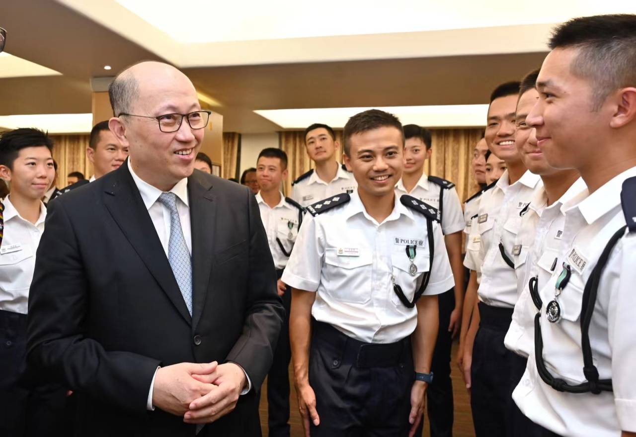 會操儀式後,鄭雁雄與即將走上新崗位的28名督察和127名警員親切會面交流並合影留念,勉勵大家為守護香港積極做貢獻。