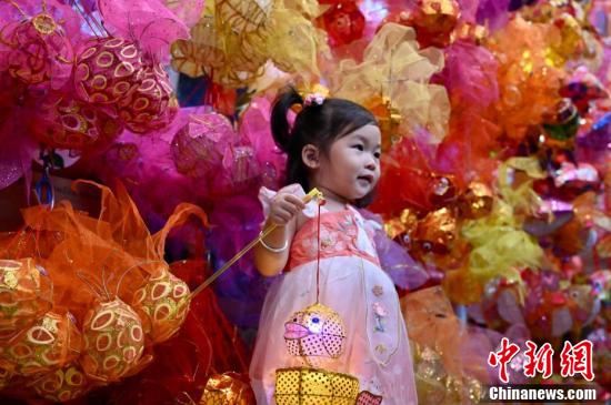 中秋佳節即將到來,9月20日,香港有市民到位於元朗大橋街市的「燈籠街」選購傳統燈籠。「燈籠街」現場挂有近千個傳統手扎燈籠,吸引不少大人及兒童拍照留念。圖為小女孩穿上漢服與傳統燈籠合影。(中新網記者 李志華 攝)