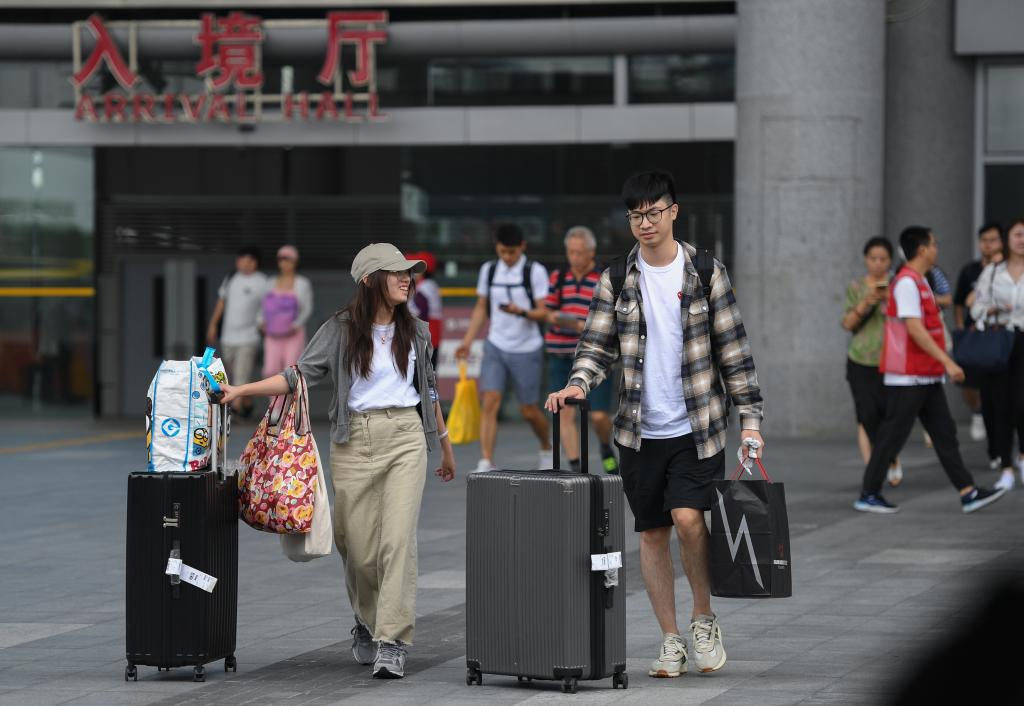 10月6日,旅客從深圳灣口岸入境。(新華社記者 毛思倩 攝)