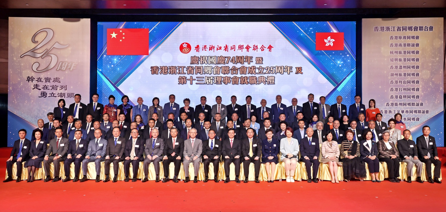 本網訊 11月10日,香港浙江省同鄉會聯合會慶祝國慶74周年暨聯合會成立25周年及第十三屆理事會就職典禮舉行。香港特區行政長官李家超、中央政府駐港聯絡辦副主任何靖、外交部駐港特派員公署署理特派員李永勝、前行政長官林鄭月娥、浙江省政協副主席葉正波等共同主禮。社會各界嘉賓800多人出席活動。
